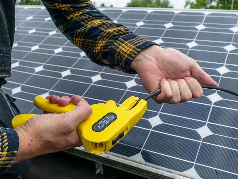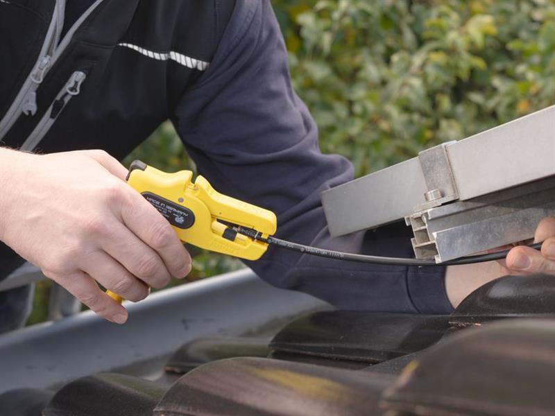 Thanks to its slim design, the wire stripper can also be used in areas difficult to access, such as on solar modules or on the inverter. Fitted with a non-slip multi-component handle. It has an eyelet to attach a strap for fall protection, and it has a labelling area where the tool can be personalised. In addition, the wire stripper has a locking mechanism for space-saving storage.