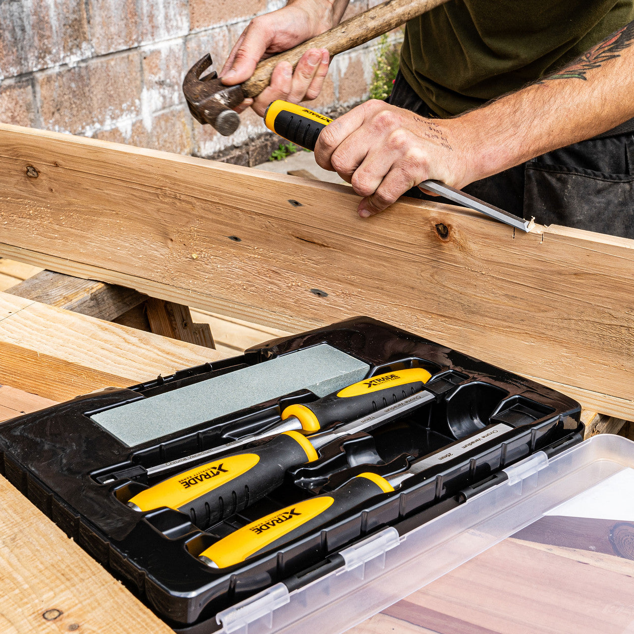 This handy chisel set from XTrade comes stored in a plastic carry case for safekeeping and is supplied with a sharpening stone so your chisels are always sharp and ready to go. Quality chisels you can trust, sharpen them time and time again. They feature long-lasting chrome vanadium blades and soft grip handles for user comfort.